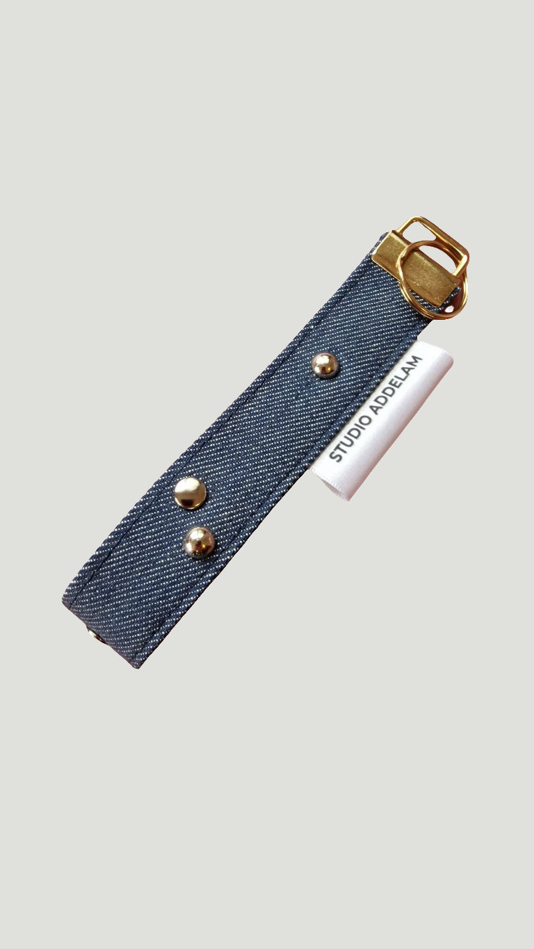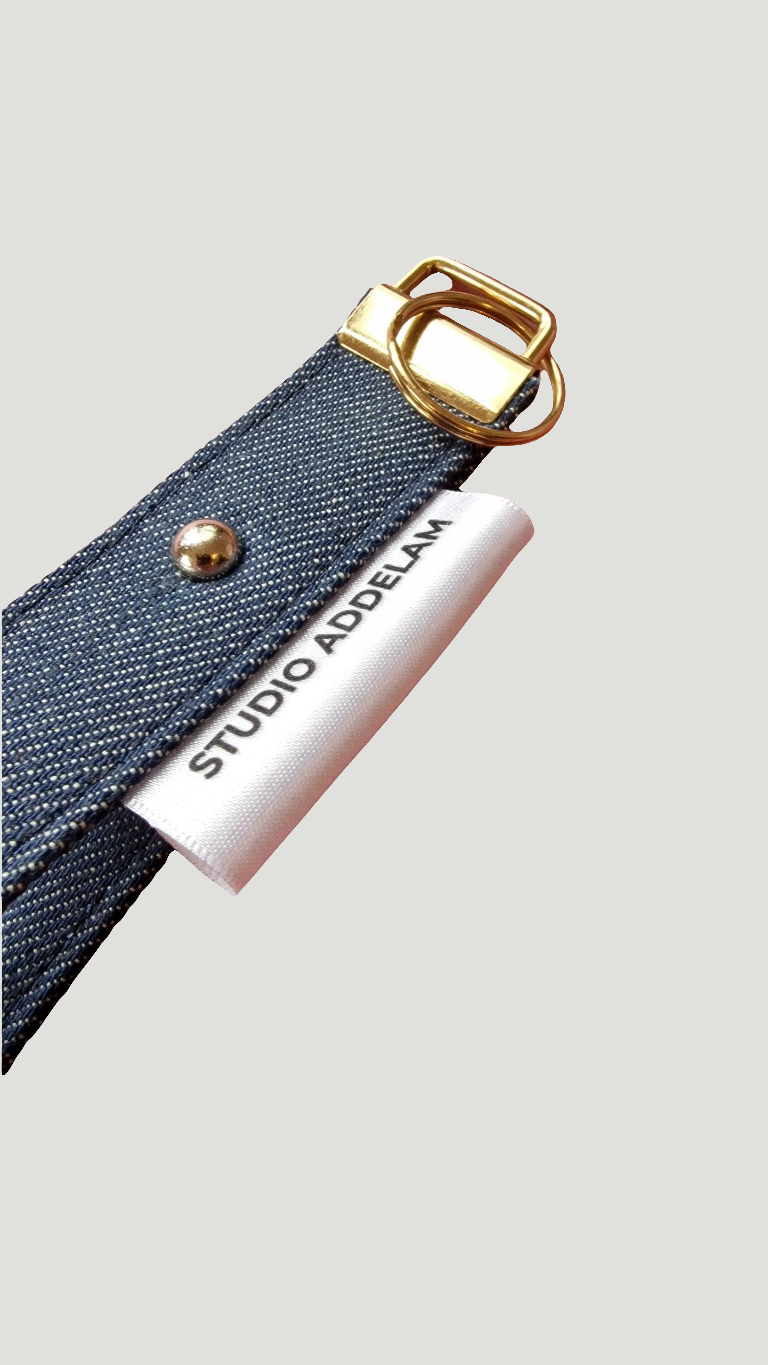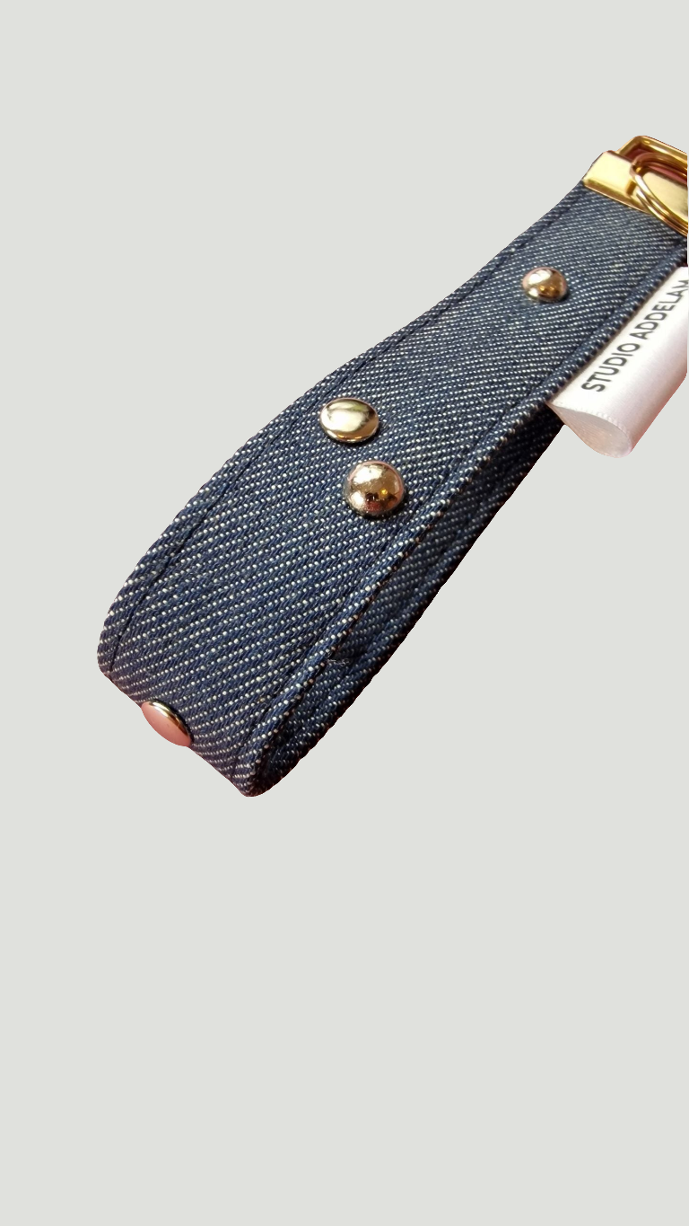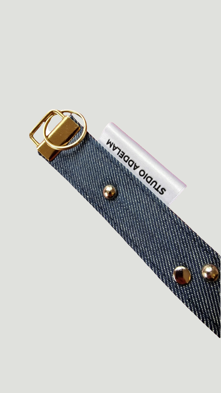 Made from premium Japanese denim cloth, gold coloured hardware, with the addition of decorative metal studs.